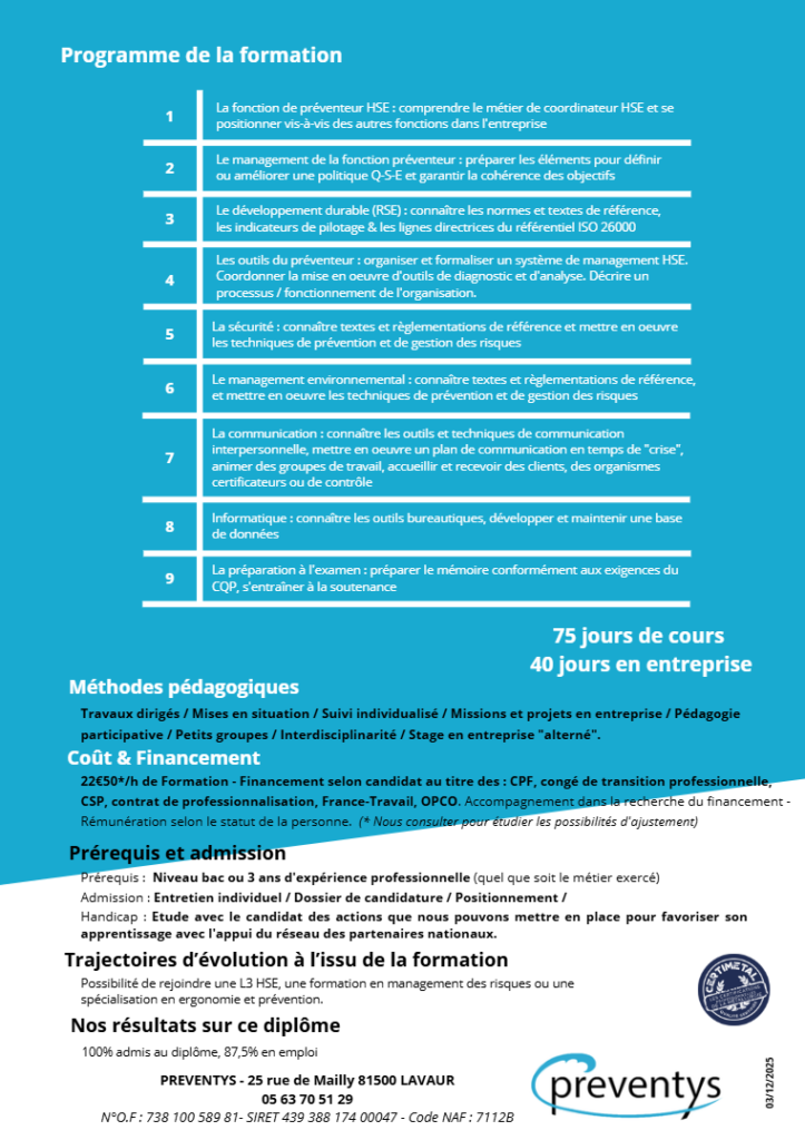 Préventeur Santé-Sécurité au travail et Environnement